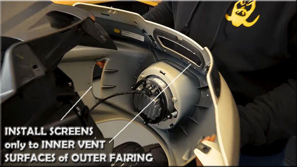 - Remove 3M protective film and carefully place the screens in position. Care must be taken during installation to position the screens so that 3M Tape isn’t visible from outside the fairing. Alternately, installer may opt to transfer/reposition 3M tape from side screens to inner surface of fairing vent openings (locations as per photo above) to ensure tape is not visible when outer fairing is re-installed. The sole purpose of 3M tape is to keep screens in position while reinstalling fairing