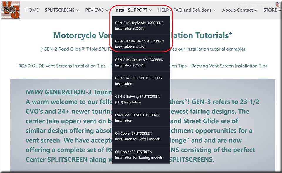 ![[non-clickable SCREENSHOT] Begin by clicking "SUPPORT" (#1 top-center red-outline) for information on using the MENU system. Hover your CURSOR over "SUPPORT" to reveal DROP-DOWN MENU (items 2-4). Click each menu item to view the appropriate instructional web-page. Important SPLITSCREEN(S) Installation Information.](https://motorcycleventscreens.com/wp-content/uploads/2024/06/mVS-SUPPORT-Menu-new-web.jpg)